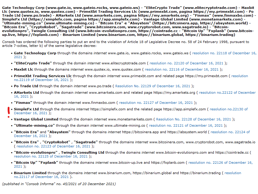In addition to this, it should be pointed out that SimpleFX does not have a good track record with regulators, especially in the European Union. In December 2021, the Italian financial regulator Commissione Nazionale per le Societa e la Borsa (CONSOB) blacklisted SimpleFX. In previous years, other EU regulators have also taken action against this broker.