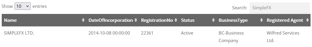 SimpleFX is owned and operated by SimpleFX Ltd, a company stated to be incorporated in Saint Vincent and the Grenadines (SVG). A check of the Financial Services Authority (FSA) of St. Vincent and the Grenadines database confirms that the SimpleFX Ltd is registered there: