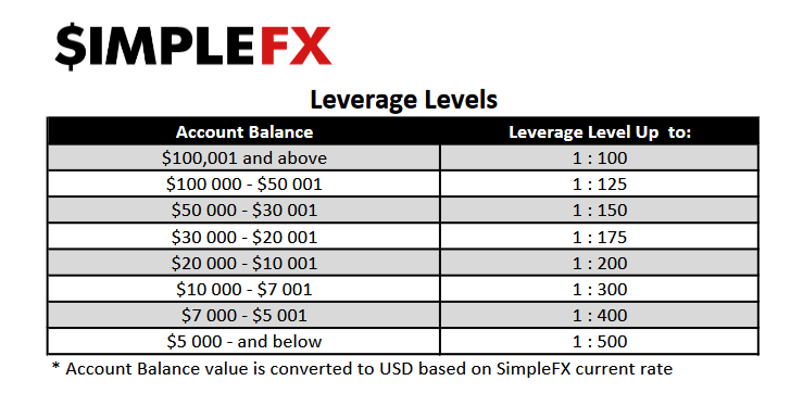 Leverage ranges from 1:100 to 1:500 depending on the size of the account balance. Counter-intuitively, the highest level of leverage, which also carries the highest risk, is reserved for the accounts with the lowest investments.